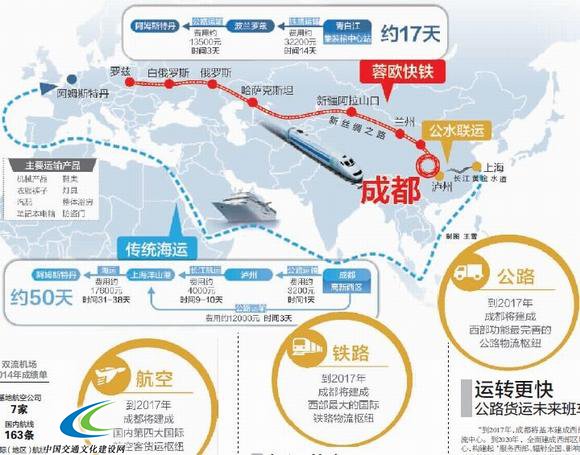 “现在最有优势的就是蓉欧快铁。”物流办相关负责人表示,蓉欧快铁大通道直通,全程9826公里,现已将超过5.8亿美元的货物快速输出欧洲。这条物流大通道为成都参与“一带一路”建设奠定了互联互通的物流优势。据介绍,到2017年,成都将建成西部最大的国际铁路物流枢纽,铁路集装箱吞吐量超过60万标箱,“蓉欧快铁”往返班列实现每周2列以上稳定运行,分别建成中欧两端(青白江与波兰罗兹)亚欧国际物流贸易转运中心;到2020年,铁路集装箱吞吐量超过80万标箱,“蓉欧快铁”往返班列实现每周4列以上稳定运行,铁路货运班列总数达15条以上。