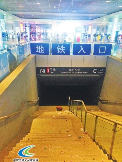 记者近日探访发现,郑州东站的地铁C入口正好处在乘客集中检票出高铁站的地方,该入口的玻璃围栏上,确实有多处写着“地铁入口”,非常显眼。但是该入口的人行步梯上,散落着垃圾,不时有下高铁的乘客拖着行李箱走到入口跟前,才发现无法进入。