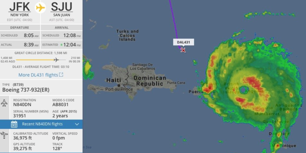 9月6日正是“伊尔玛”笼罩加勒比海诸岛的关键时刻,按照预报,飓风中心将擦着波多黎各岛向西北方向运行,这时大部分航班都已取消,只有少数几个实在来不及取消的航班,如捷蓝航空的两班和美国航空的一班,硬着头皮往前飞,在这其中,也有DAL431颤颤巍巍的小身躯。