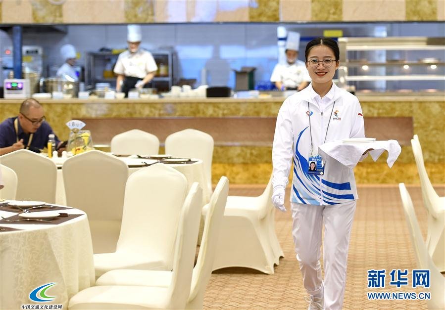 图为9月5日,志愿者在新闻中心餐厅为中外媒体记者提供服务。