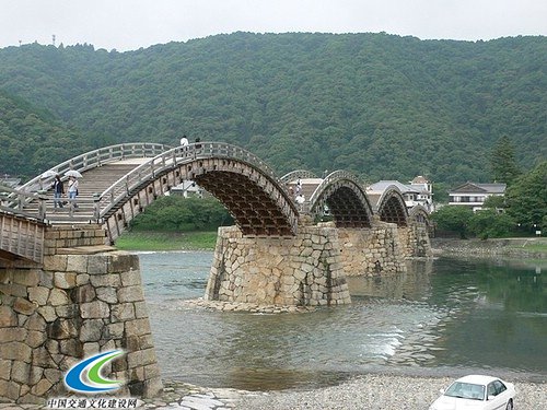 日本山口县锦带桥(Kintai Bridge)(1673年) ,位于日本山口县岩国市的锦川河上,是一座五孔石墩木拱桥,跨度27.5米,全长193.3米,宽5米,1673年首次建造完成,是日本三大名桥之一。因其景致而被称为“锦带桥”。全桥只用包铁和插销固定,是一座充分应用精巧木工技术的桥梁结构。不过这座桥也算得上是世界上最“不幸”的一座桥。大桥最早建于1673年,修建过程中屡次被洪水冲塌。建成后又于1950年被一场台风带来的洪水摧毁。1953年重建,后又在2001年和2004年部分修复。
