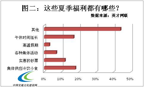 在“这些夏季福利都有哪些?”这项调查中,选择“集体供应冷饮小食”和“午休时间延长”的人最多,分别有18%和17%的人选择这两项;选择“实惠的钞票”的人有12%;选择“各种集体活动” 和“高温假期”的调查者分别占7%和3%;另有44%的人选择“其他”。(见图二)