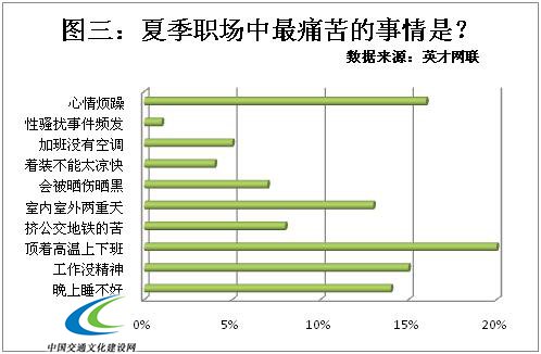 那么,夏季职场中最痛苦的事情是什么呢?在这一项调查中,有20%的被调查者选择了“顶着高温上下班”;选择“工作没精神”和“晚上睡不好”的被调查者分别有15%和14%;还分别有16%和13%的被调查者分别选择了“心情烦躁”和“室内室外两重天”;选择“挤公交地铁的苦”和“会被晒伤晒黑”的被调查者分别占8%和7%;另分别有5%和4%的被调查者选择了“加班没有空调”和“着装不能太凉快”。