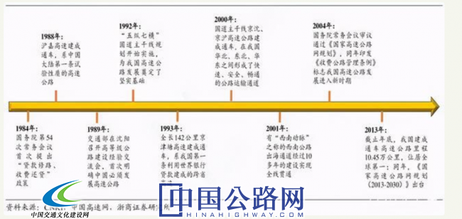 自1988年第一条高速公路沪嘉高速建成通车以来,我国高速公路的建设发展一共历经起步(1988–1992)、加速(1993–1997)、大发展(1998至今)三个阶段,自2013年起我国高速总里程保持全球第一,截至2019年底通车高速里程合计14.96万公里,1988年–2019年复合增长27%。