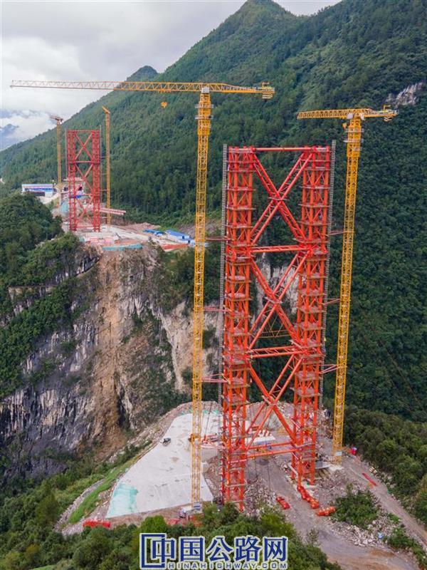 8月16日,宜来高速公路鹤峰东段溇水河特大桥施工现场,两座高120米的扣塔耸立在峡谷之上,工人正在进行铰座、缆塔施工。该大桥是宜来凤高速公路鹤峰东段控制性工程,为钢箱拱桁架桥,主跨310米,横跨溇水河谷,由湖北交投投资建设,中铁大桥局六公司施工。