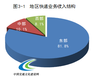 1月,东、中、西部地区快递业务收入的比重分别为81.8%、10.1%和8.1%,业务量比重分别为81.7%、11.3%和7%。与去年同期相比,东部地区快递业务收入比重下降了1个百分点,快递业务量比重上升了0.6个百分点;中部地区快递业务收入比重上升了0.6个百分点,快递业务量比重上升了0.2个百分点;西部地区快递业务收入比重上升了0.4个百分点,快递业务量比重下降了0.8个百分点。