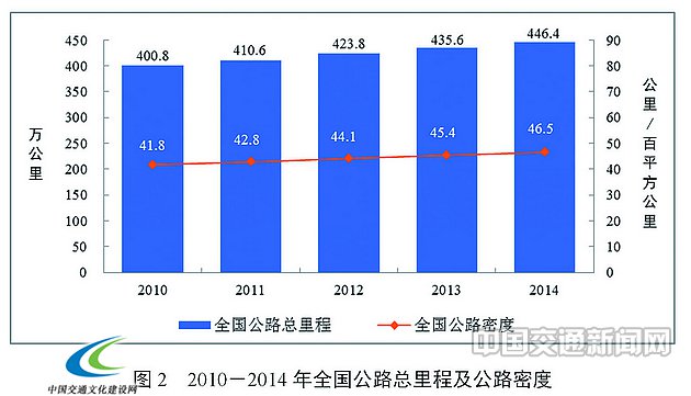 年末全国公路总里程446.39万公里,比上年末增加10.77万公里。公路密度46.50公里/百平方公里,提高1.12公里/百平方公里。公路养护里程435.38万公里,占公路总里程97.5%。