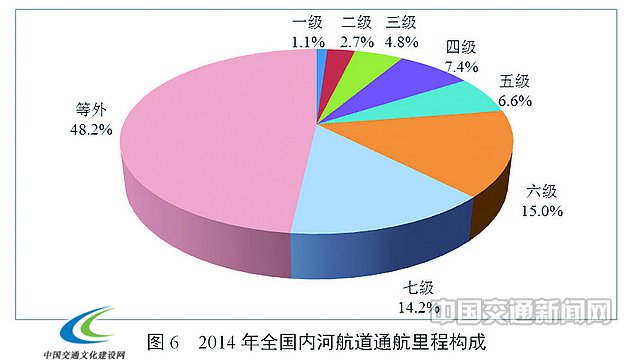各等级内河航道通航里程分别为:一级航道1341公里,二级航道3443公里,三级航道6069公里,四级航道9301公里,五级航道8298公里,六级航道18997公里,七级航道17913公里。等外航道6.09万公里。