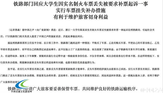 早前报道:【浙大学生起诉铁路部门因实名制车票丢失被迫补票】浙江大学学生小陈近日上车前发现丢了火车票,在列车上她向列车长出示了12306网站购票成功短信、邮件和身份证等,却仍被要求全价补票,并且无法退票。小陈感到不合理,便将昆明铁路局告上法庭。杭州铁路运输法院已正式立案受理。