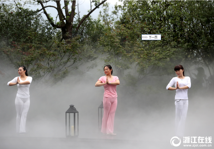9月23日,杭州淳安青溪新城,瑜伽爱好者们正在刚投用不久的滨湖景观飘带段晨练。这条景观飘带设置了骑行绿道、“糖化罐”雕塑、风车城堡广场等,与一旁建成的千岛湖啤酒小镇实现风格上的统一。