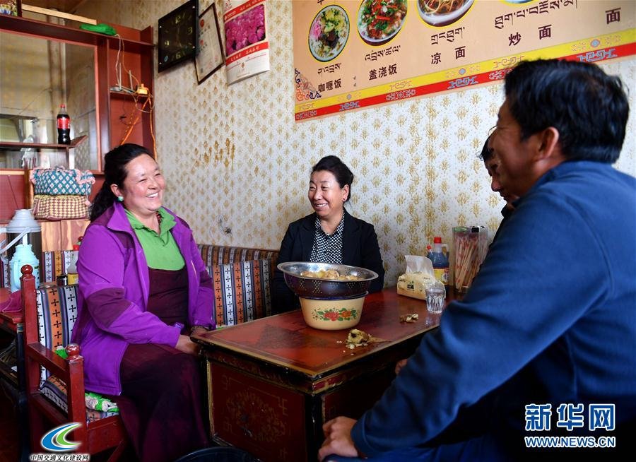 西藏自治区拉萨市城关区纳金乡塔玛村党总支第一书记格桑卓嘎(中)在拉萨德吉吉祥茶馆和茶馆老板德吉(左)叙家常(10月10日摄)。