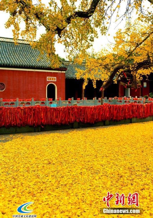 当阳玉泉寺金黄的落叶与红色寺墙相映成趣。 易红 摄