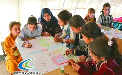 在伊拉克摩苏尔以东的哈济尔安置营,学生在一间帐篷教室内上课。新华社发