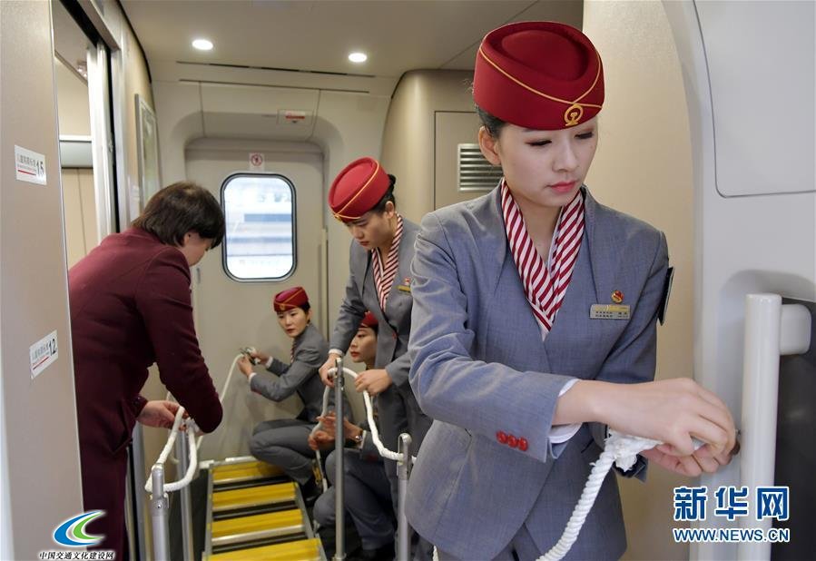 2018年春运临近,南昌客运段开展“服务春运”技能培训活动,通过礼仪培训、乘车安全培训及应急演练等活动,提高乘务人员的服务水平。新华社记者 彭昭之 摄