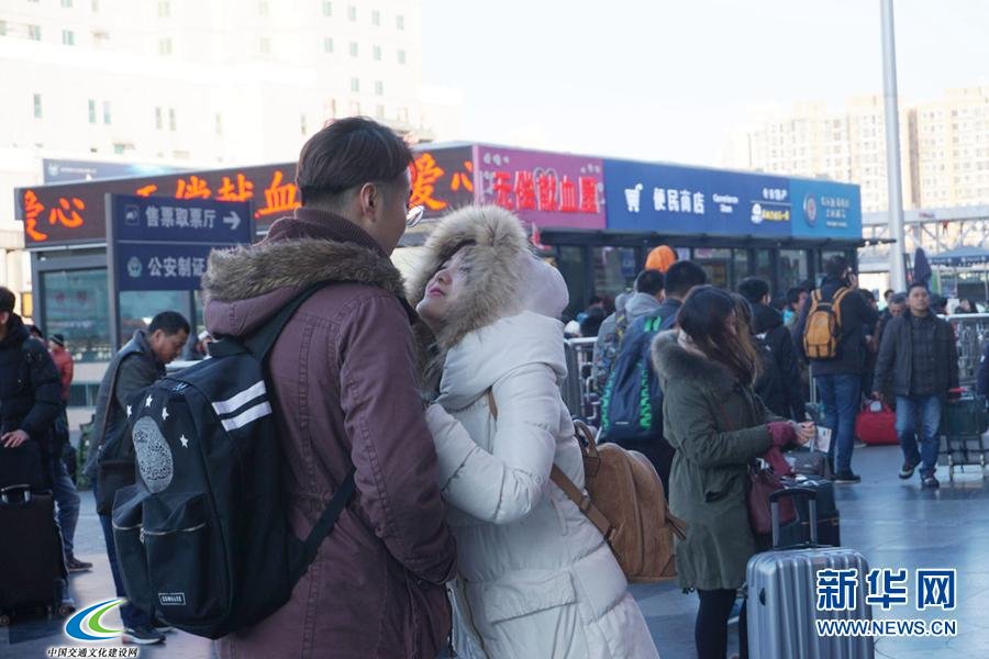 1月30日,北京西站北进站广场旅客告别。新华网 韩家慧 摄