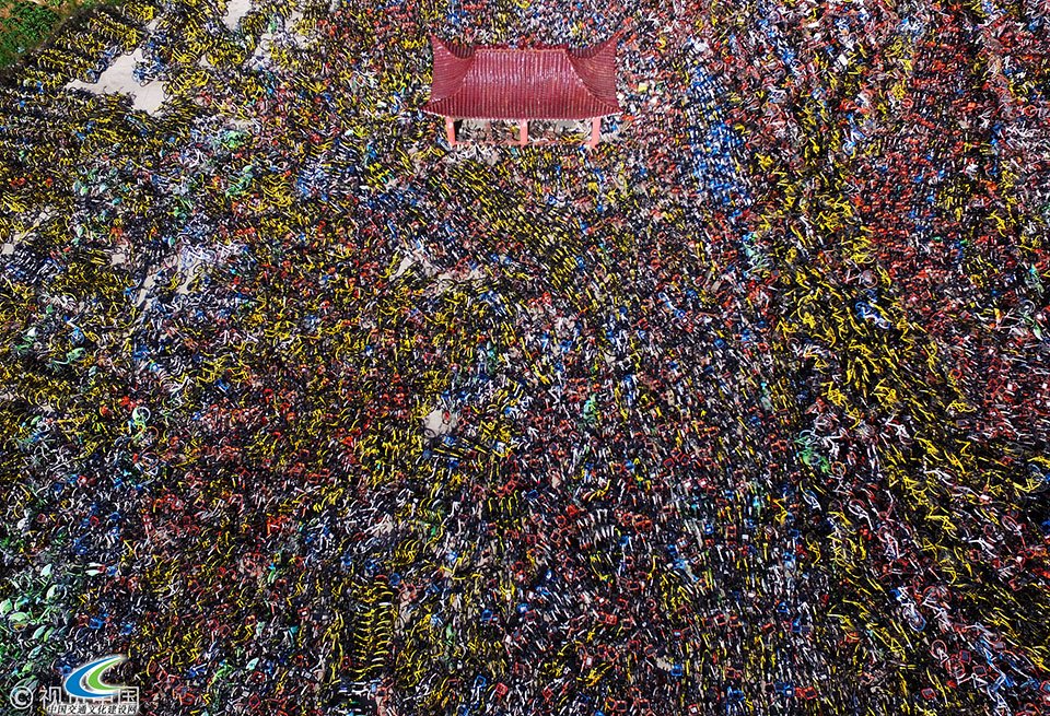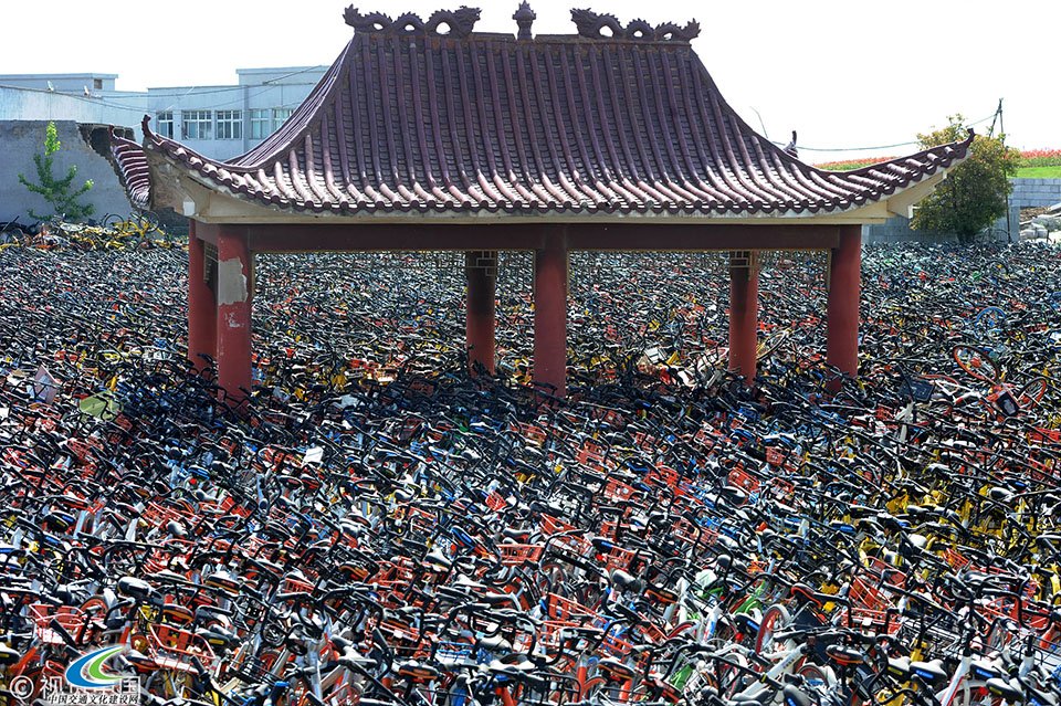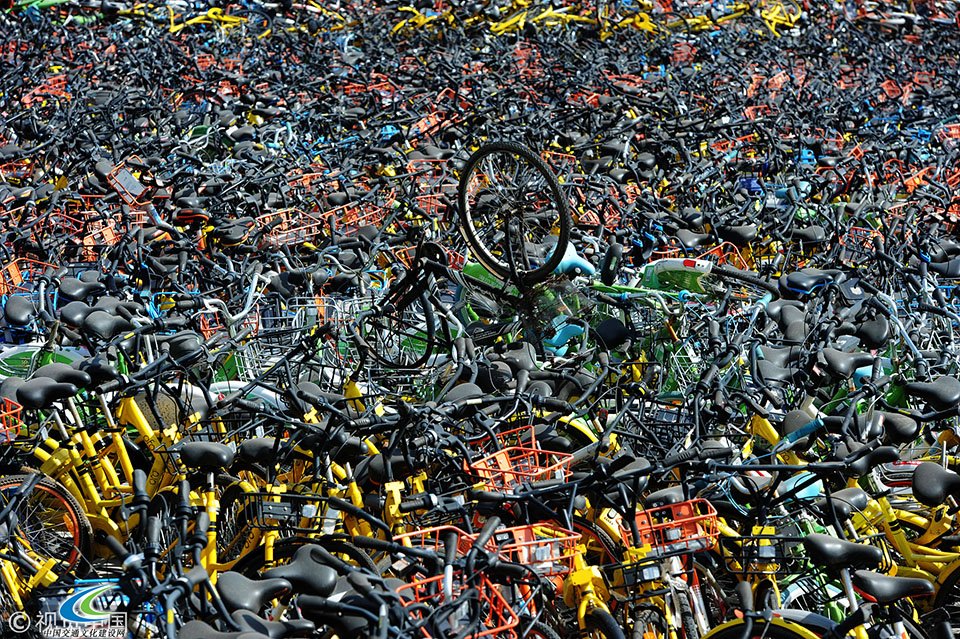 2018年4月7日,位于湖北省武汉市洪山区世茂林屿岸小区附近的一块空地上堆满了万辆共享单车。这块空地约有2000平方米,杂草丛生,空地上堆满了共享单车,这些单车叠起平均有一人多高,有的地方甚至将近两米高。