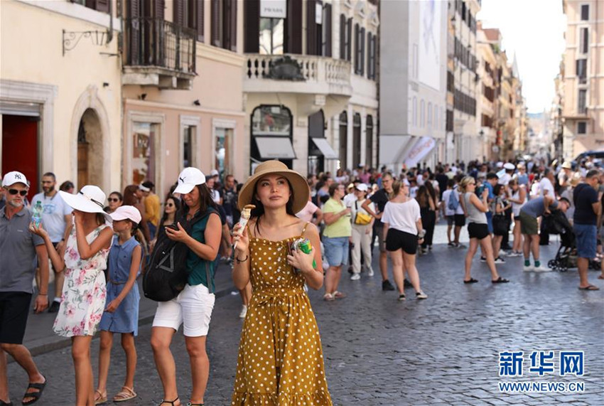 8月12日,在意大利首都罗马,一名女子在西班牙广场吃冰淇淋消暑。 当日,罗马最高气温达到37摄氏度,体感温度更是一度突破40摄氏度。 新华社记者程婷婷摄