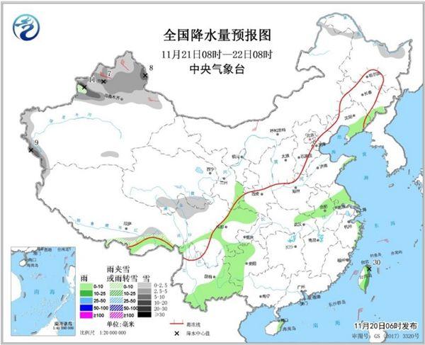 11月21日08时至22日08时,新疆北部及南疆西部山区、青海南部等地部分地区有小到中雪或雨夹雪,其中,新疆阿勒泰及伊犁河谷等地部分地区有大到暴雪(5~11毫米)。东北地区东南部、西北地区东南部、江淮大部、川西高原南部、西南地区东部、台湾岛等地部分地区有小到中雨,